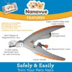 Important note: Lighting is not suitable for pure black nails. The lighting is not clear for pure black nails.(Suitable only for light-colored nails)🌟 NEW & IMPROVED PETICARE NAIL CLIPPER 🌟The illuminated nail clipper is the safe & easy way to trim your pet’s nails! The original As Seen on TV now with improvements! Improvements to the handles, lights, & nail magnifier/trapper. This tool ensures precise nail trimming for your pets.💡 Improve Visibility with Super-Bright LEDsIlluminates light colored nails’ delicate bloodline, so you can trim in the right spot! Lights have been relocated to increase visibility of your pet’s quick in their nail. For dark nails, look at the dark nail head-on; once you see a small dark circle, this is as far as you should go.🔧 5X Magnification & Nail Trapper5X the magnification & doubles as a nail trapper. The nail trapper helps catch nail clippings for easy cleanup! The precision cutting blade made of hardened steel cuts nails quickly & eliminates the struggle!👍 Vets Recommended Grooming ToolInvented by pet lovers with the help of veterinarians! Perfect for cats & dogs! This tool is recommended by vets for safe and easy nail trimming.